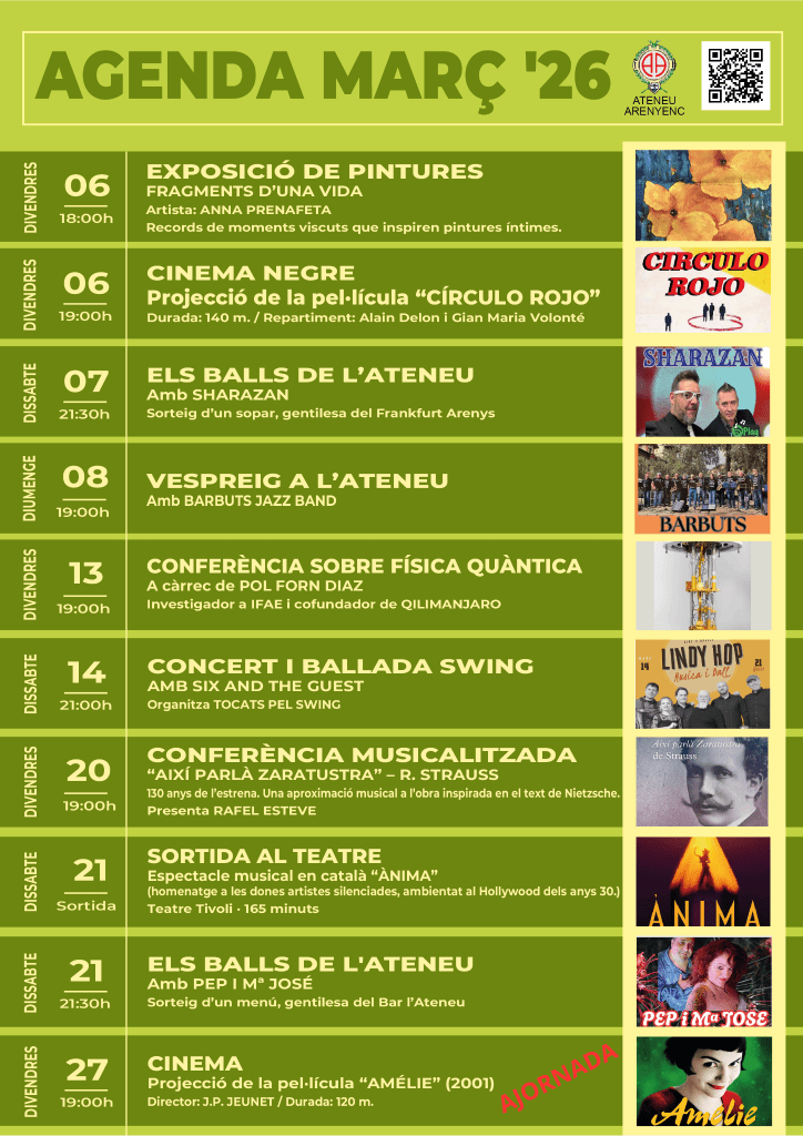 Agenda Conferències: 13 de març – CONFERÈNCIA 🔬 Balls: 14 de març – CONCERT I BALLADA DE SWING Conferències: 20 de març – CONFERÈNCIA MUSICALITZADA Sortides: 21 de març – SORTIDA 🎭 Balls: 21 de març- ELS BALLS DE L’ATENEU Ateneu: VIATGE A ESCÒCIA Veure’n més… Notícies Ateneu: ASSEMBLEA GENERAL ORDINÀRIA 2026 Ateneu: Nova Junta Directiva de l’Ateneu Arenyenc Ateneu: Informació sobre el nou CURS 2025-26 Ateneu: CELEBRACIÓ DEL 140È ANIVERSARI DE L’ATENEU Veure totes les notícies